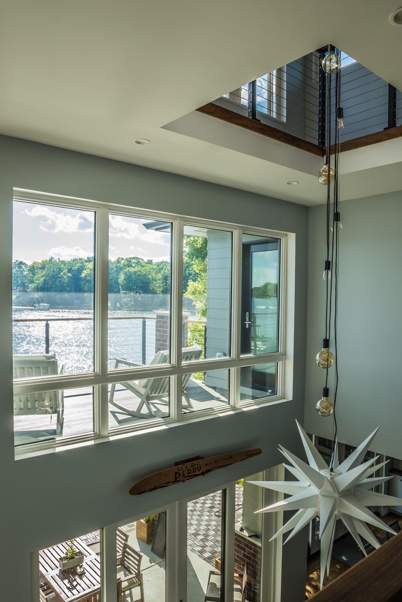 Simple but striking design elements are built into multiple aspects of the home, such as the wall of built-ins and the fireplace, adding just the right amount of character to the living area while keeping a focus on the natural light and lake views. While a home suspension cable staircase in the middle of the home, creating contrast in design elements.